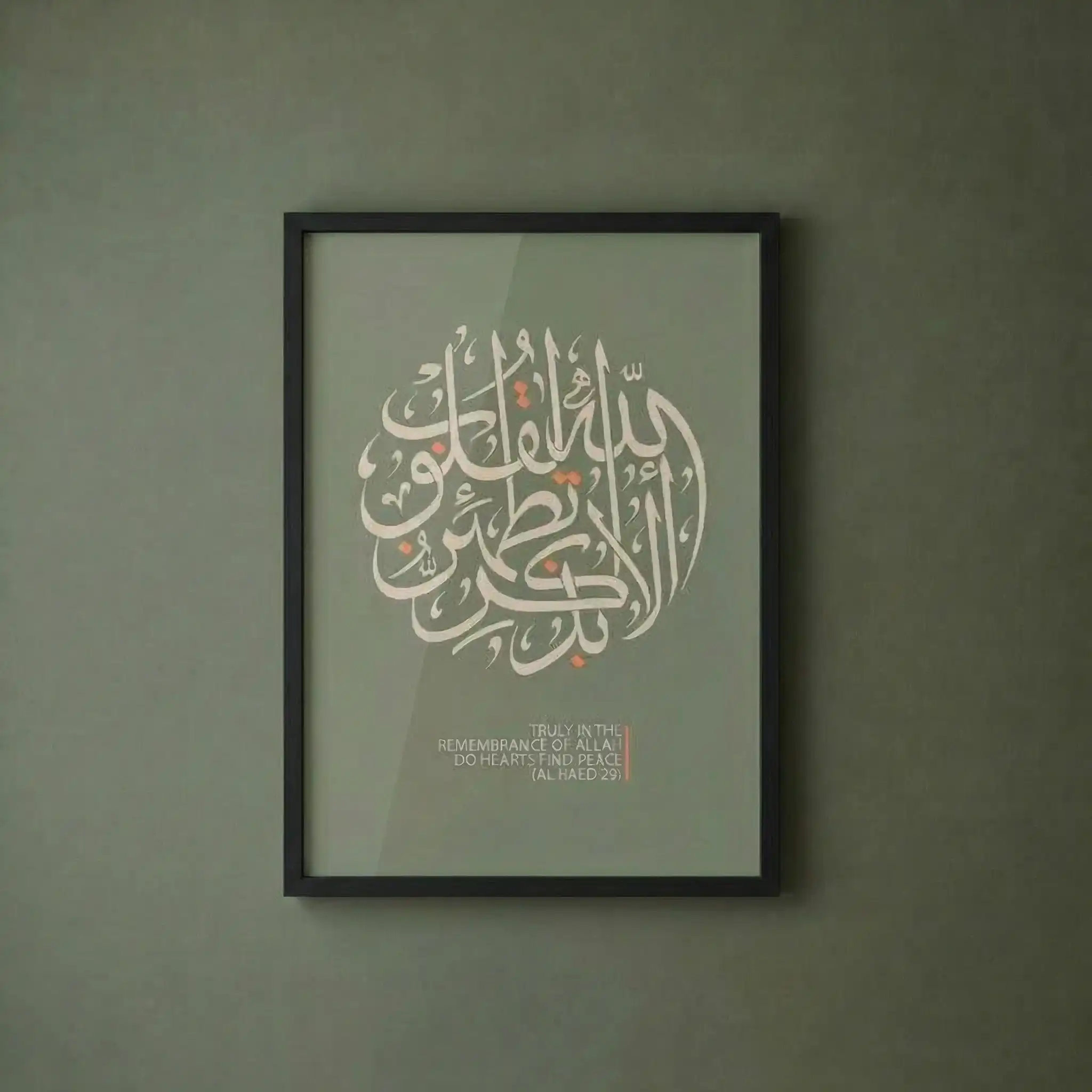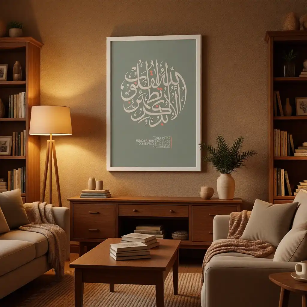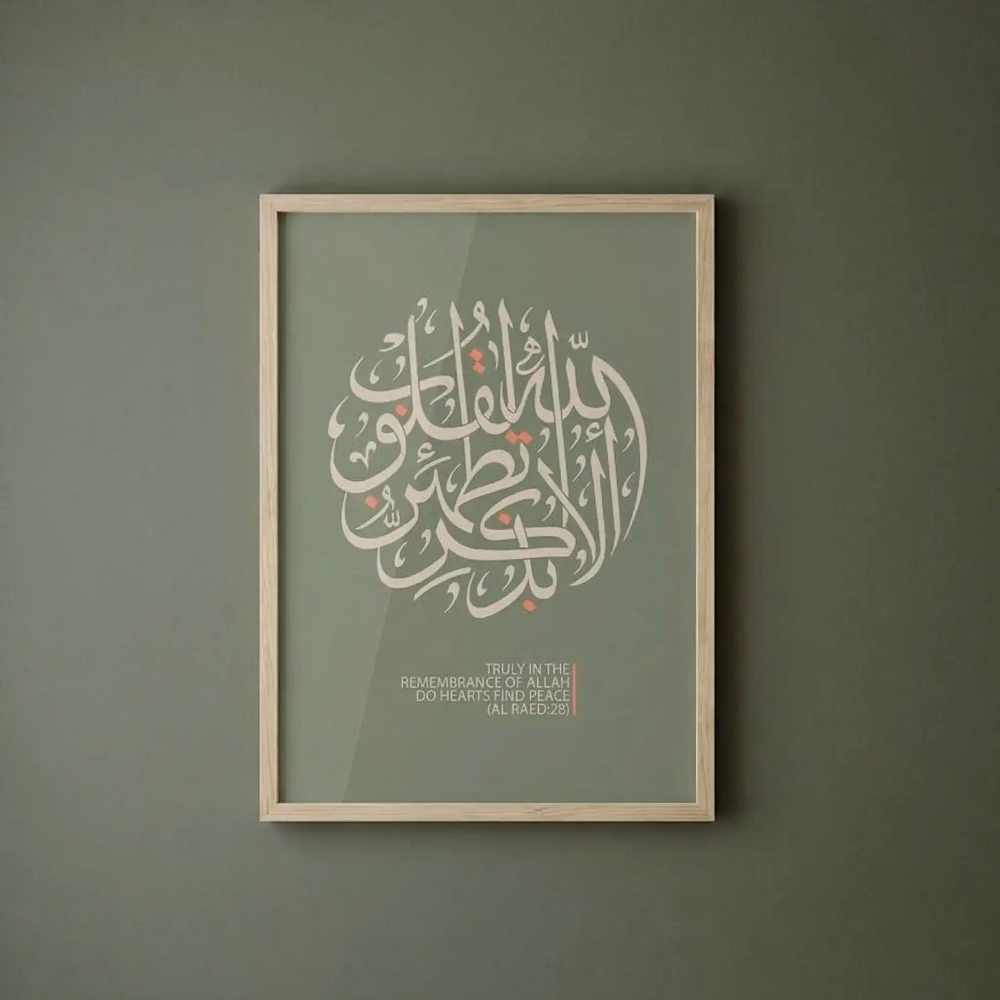 تم تصميم الخط العربي بأسلوب دائري عصري على خلفية بلون أخضر نباتي هادئ، لتجمع بين الروحانية الخالدة ولمسة التصميم الداخلي المعاصر.