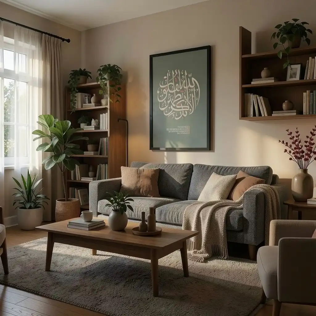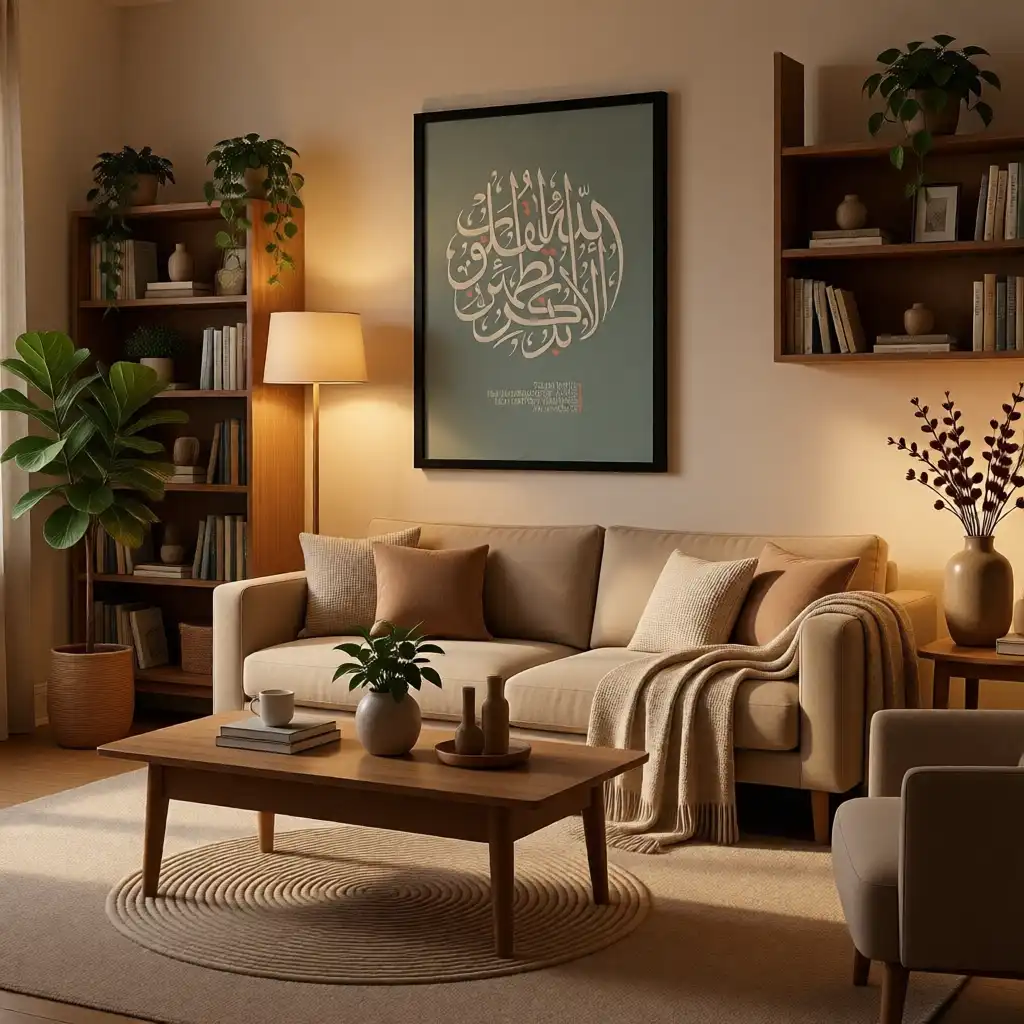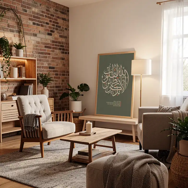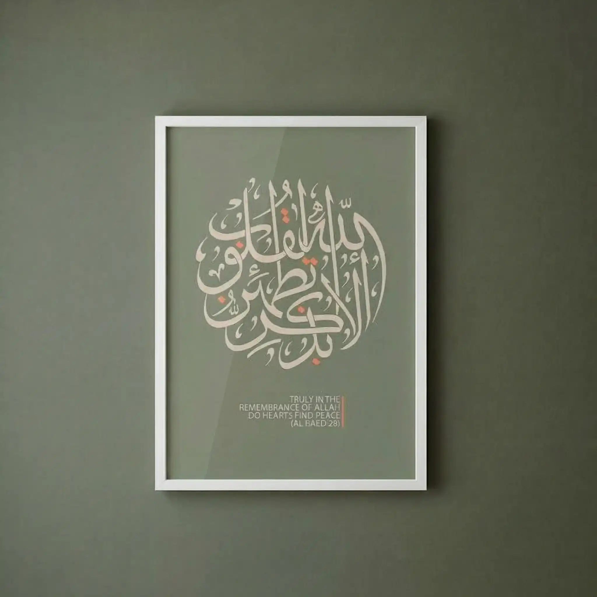 تم تصميم الخط العربي بأسلوب دائري عصري على خلفية بلون أخضر نباتي هادئ، لتجمع بين الروحانية الخالدة ولمسة التصميم الداخلي المعاصر.