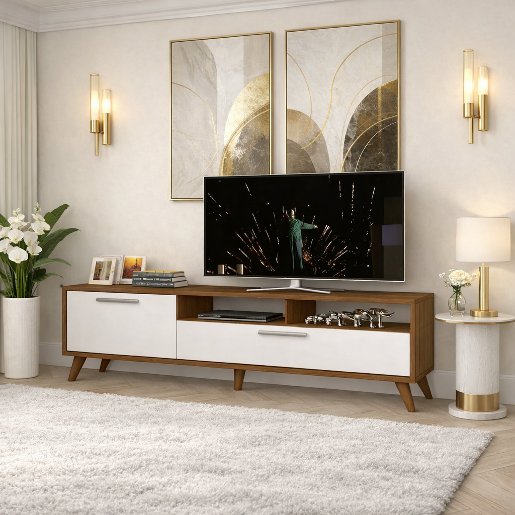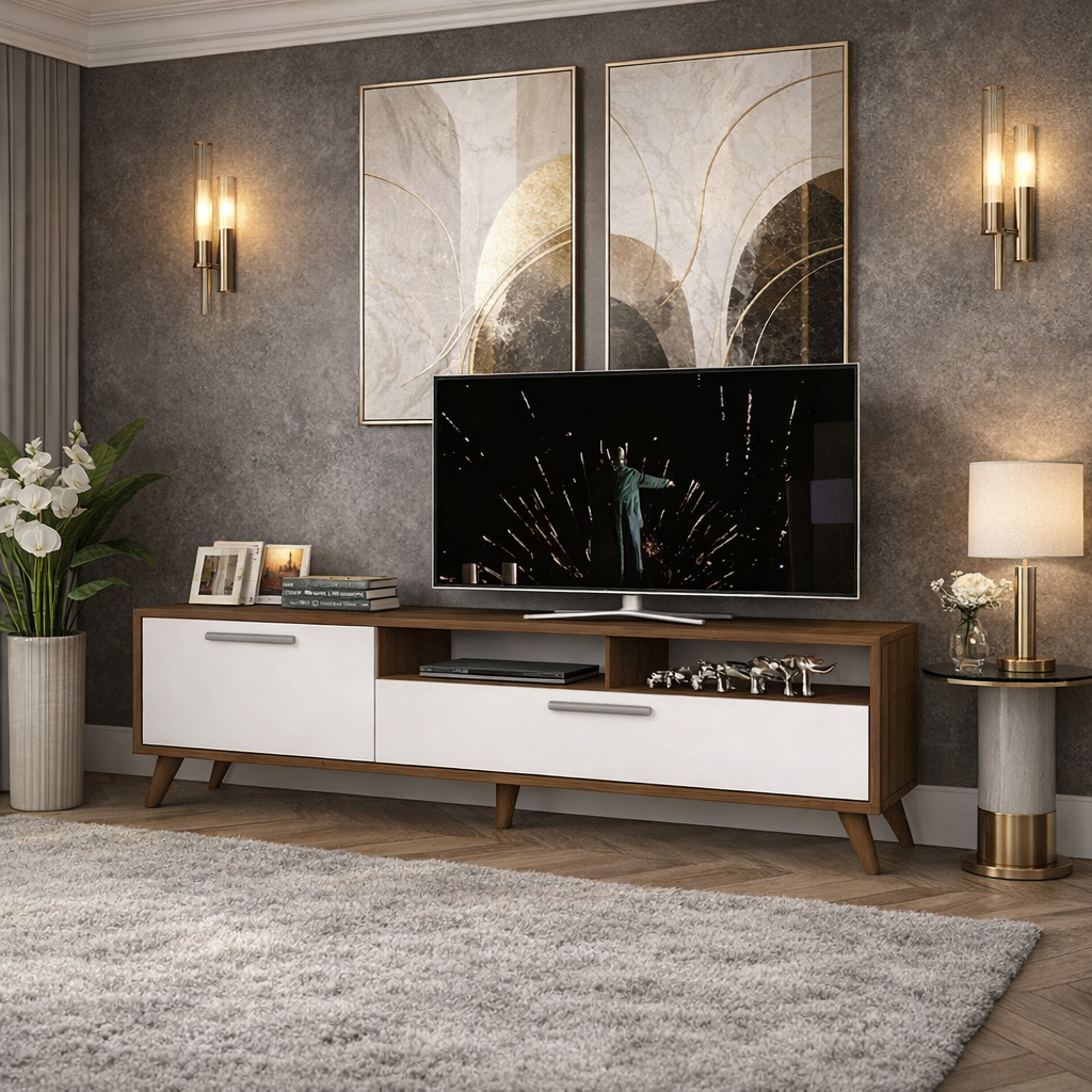 استمتع بتجربة مشاهدة تلفزيونية لا تُنسى مع ترابيزتنا الخشبية المصنوعة يدويًا من تشيب بورد خشب مضغوط عالي الجودة، تتميز هذه الطاولة بتصميم عصري أنيق وأرجل قوية تضمن ثباتها