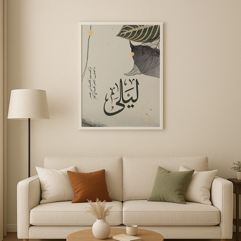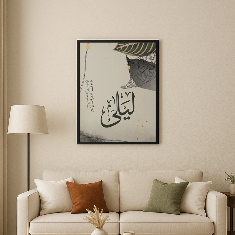 Add a touch of sophistication and nature’s beauty to your space with this stunning Arabic calligraphy artwork. Featuring a delicate blend of earthy tones, botanical elements, and elegant typography, this piece is a perfect mix of modern and traditional aesthetics.
