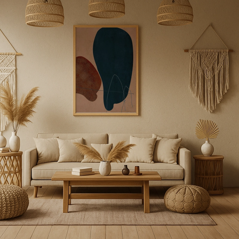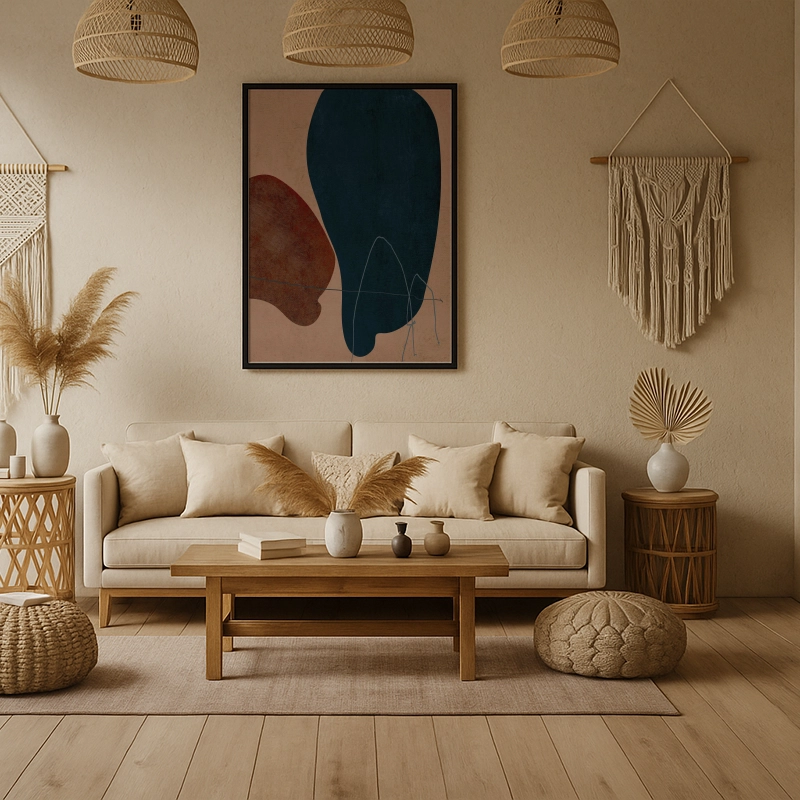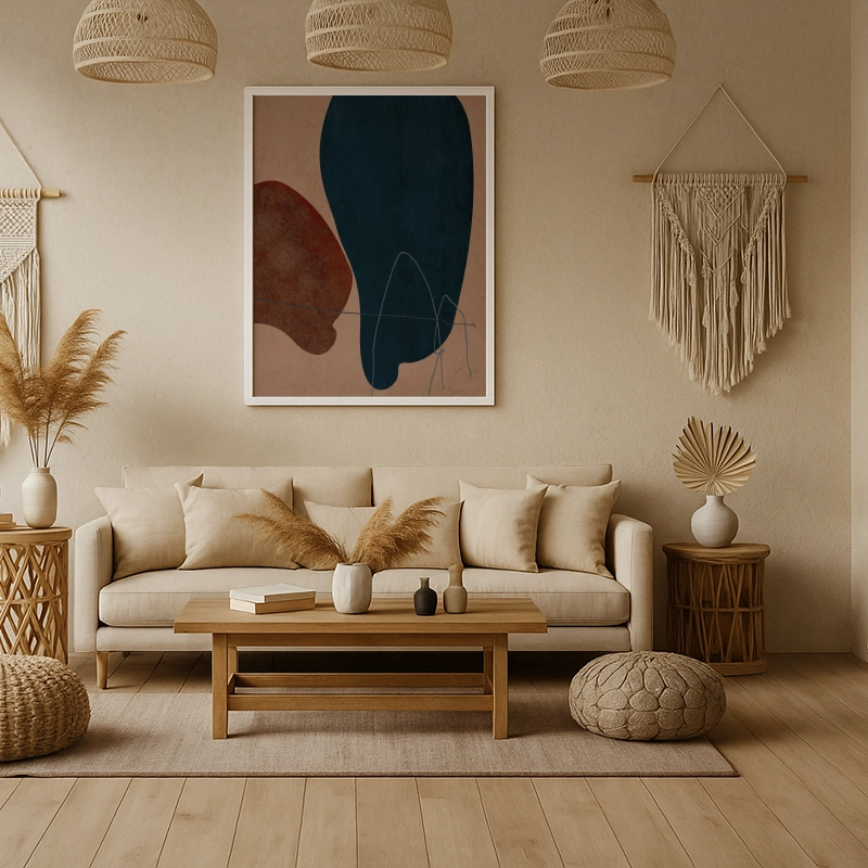 A captivating interplay of organic forms and earthy tones, this abstract composition evokes a sense of calm and balance. Deep midnight blue and warm rust-red hues float effortlessly over a textured, neutral background, accented by delicate, hand-drawn lines. The contrast between bold shapes and subtle detailing makes this piece a striking yet harmonious addition to any contemporary interior.