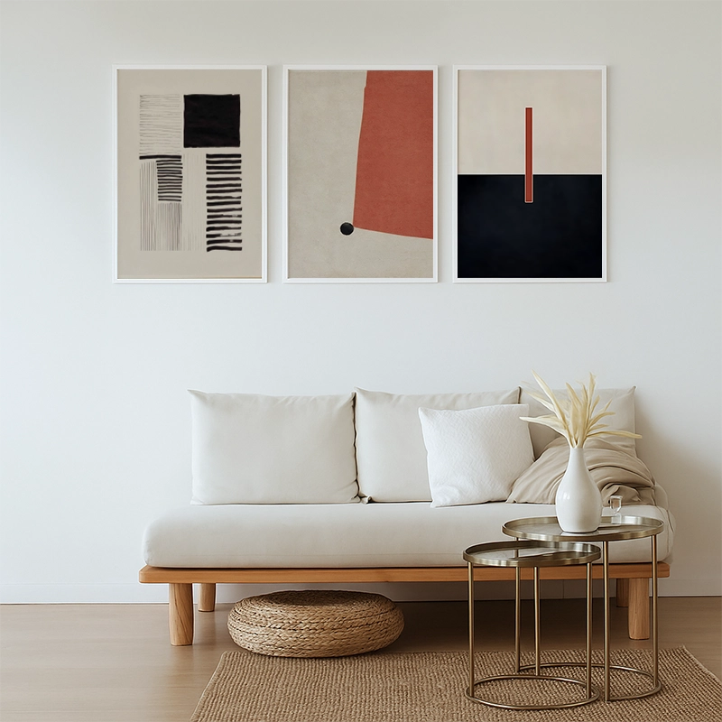 Redefine your space with Noir Formations, a sophisticated trio of minimalist abstract artworks designed to captivate. Each piece balances bold geometry with quiet restraint — from expressive lines and grids to striking color blocks in black, ivory, and deep terracotta. Together, they tell a story of structure, rhythm, and thoughtful tension — ideal for intimate dining spaces, creative studios, or modern home interiors.