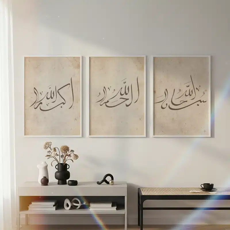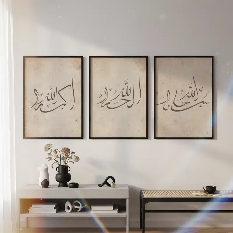 Create a balanced and spiritually uplifting wall display with this beautiful set of 3 Islamic calligraphy framed prints. Each artwork features a meaningful Arabic phrase written in elegant calligraphy, presented on a soft neutral background that blends effortlessly with modern and minimalist interiors.