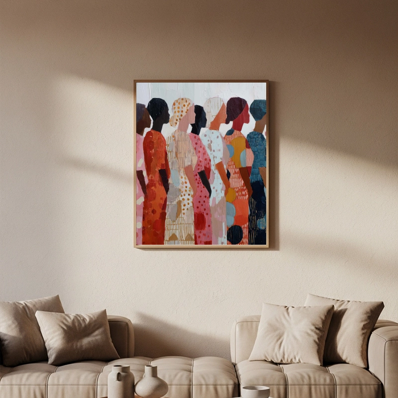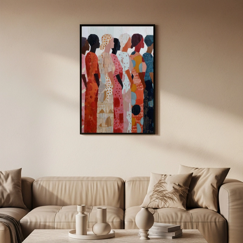 Make a bold artistic statement with the Sisterhood Mosaic: Collective Joy framed canvas. This stunning piece is a tribute to community, color, and resilience, designed to be a vibrant and meaningful focal point in your contemporary space.