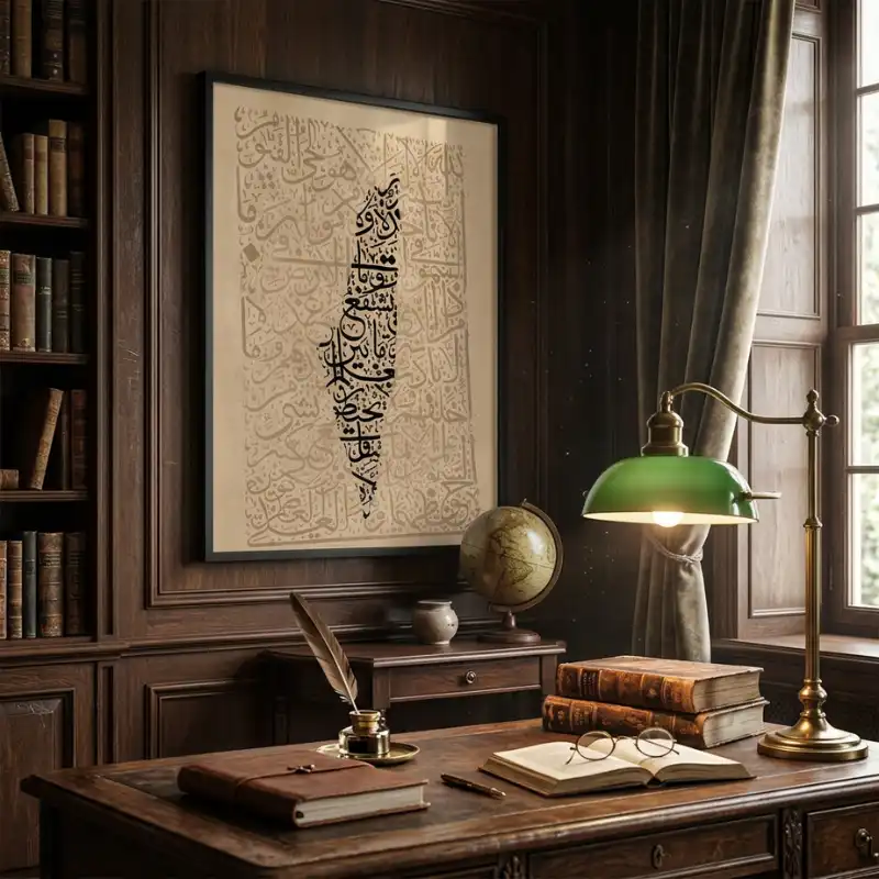 Celebrate heritage, identity, and timeless artistry with Heritage of Palestine – Arabic Calligraphy Map Wall Art. This striking piece transforms the map of historical Palestine into a beautiful composition formed entirely from expressive Arabic calligraphy.