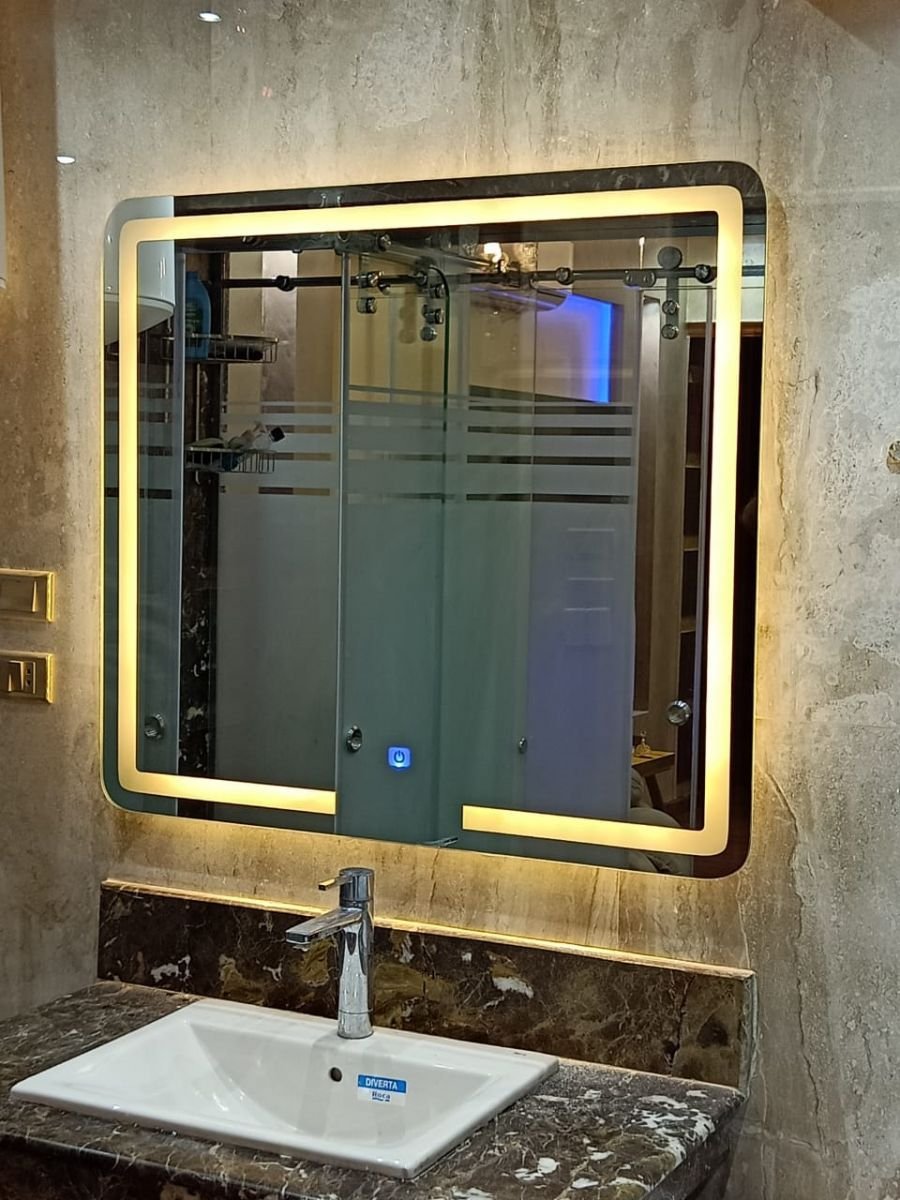 Made of Glass 4 mm, provided with Warm or White Led lighting. You can use it by touch.