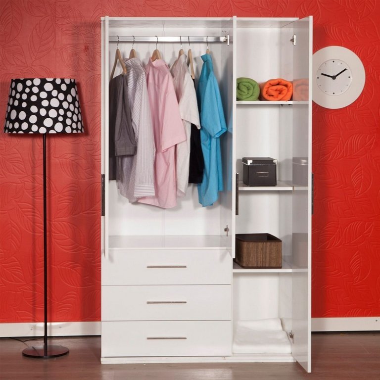 Boasting a smart painted finish, its hinged doors open to reveal a single metal rail for hanging clothes, while shelves and drawers provide additional storage for other accessories.