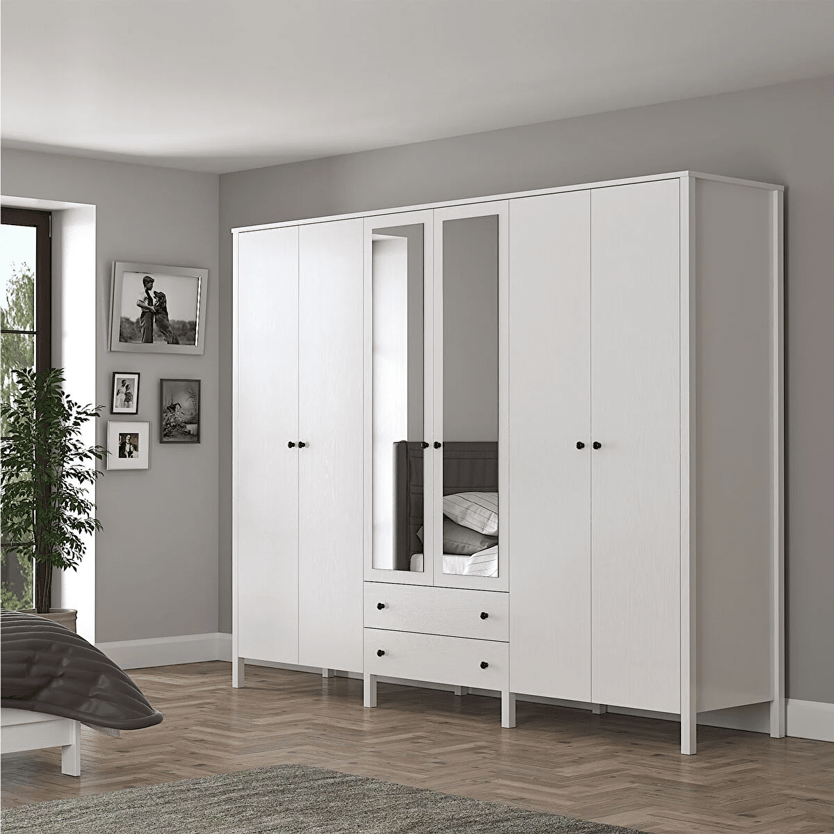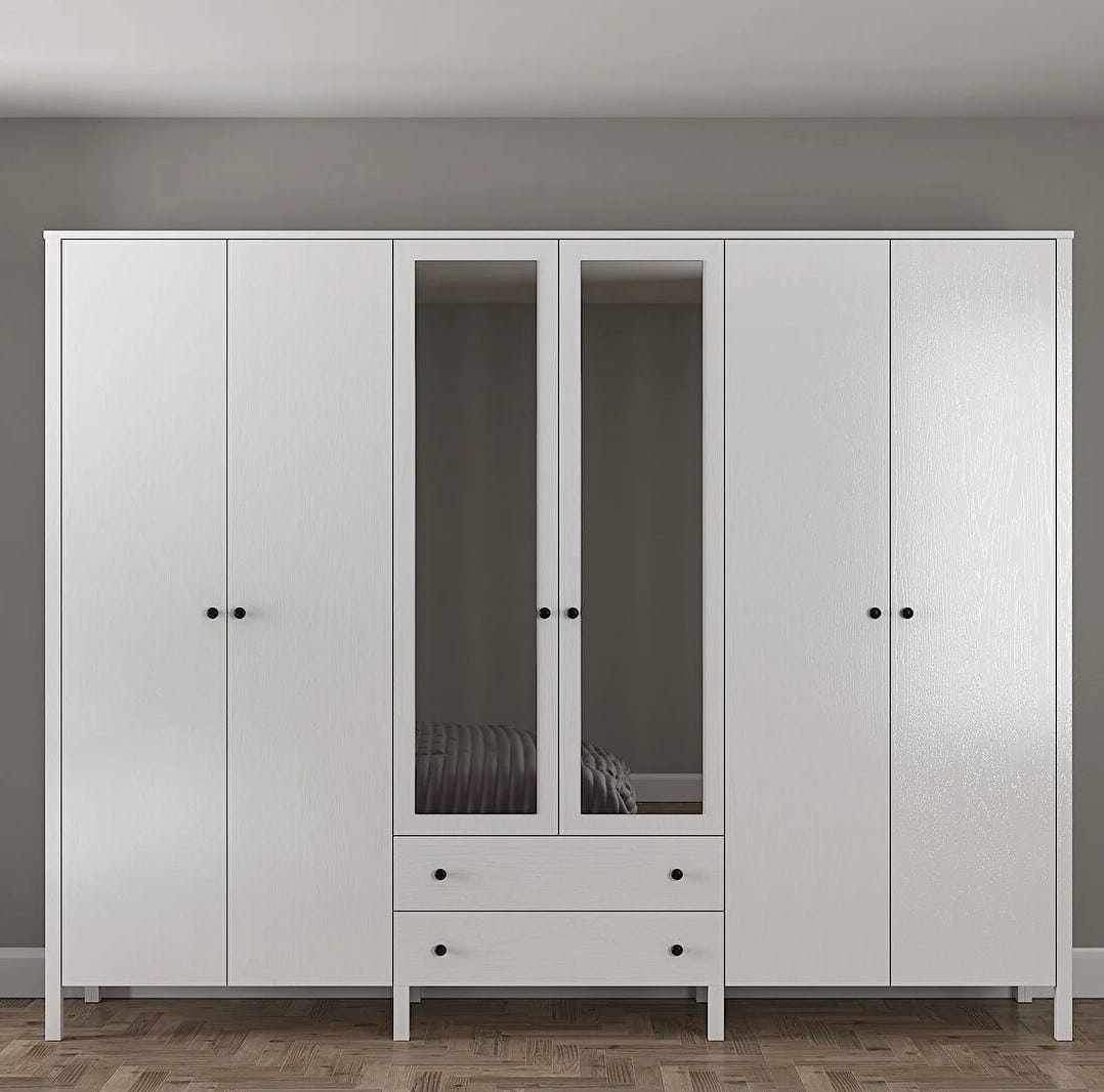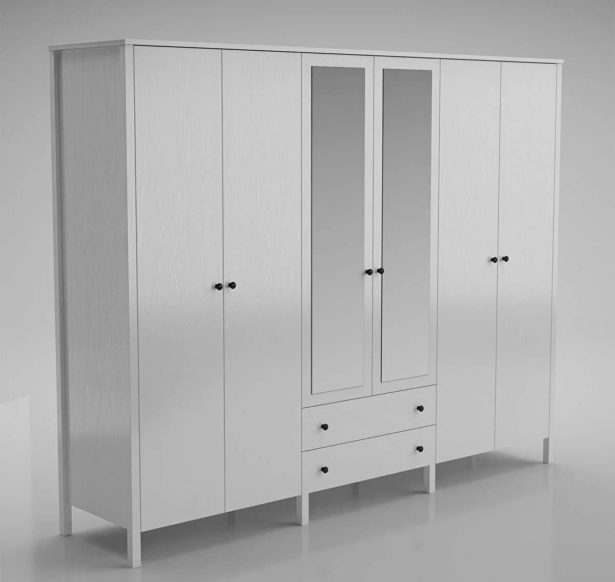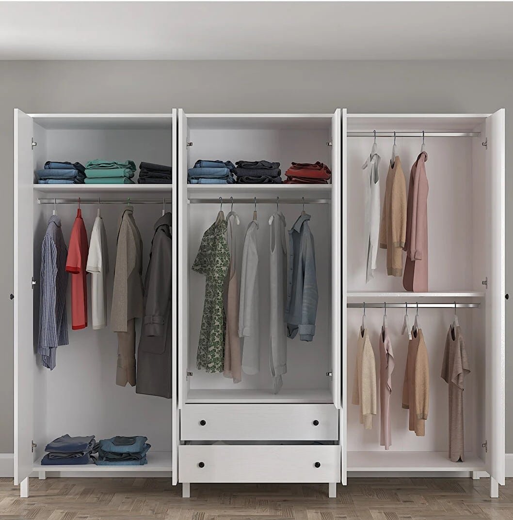 A modern wooden wardrobe made of high-quality wood, characterized by its elegant design and straight lines. The wardrobe provides ample storage space thanks to its hidden drawers and adjustable shelvesIn Stock