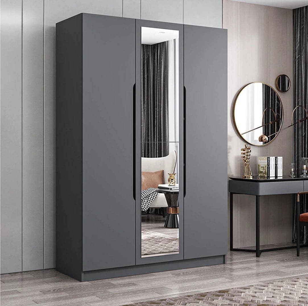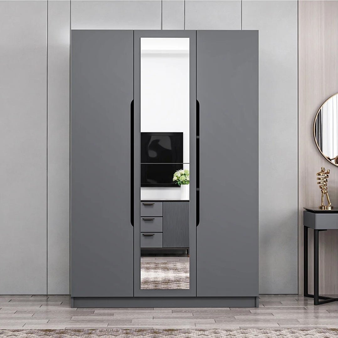 A modern wooden wardrobe made of high-quality wood, characterized by its elegant design and straight lines. The wardrobe provides ample storage space thanks to its hidden drawers and adjustable shelvesIn Stock