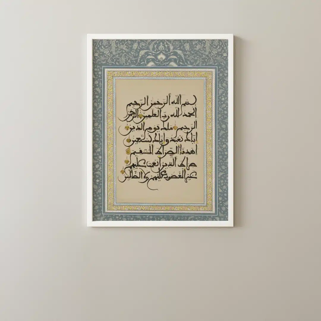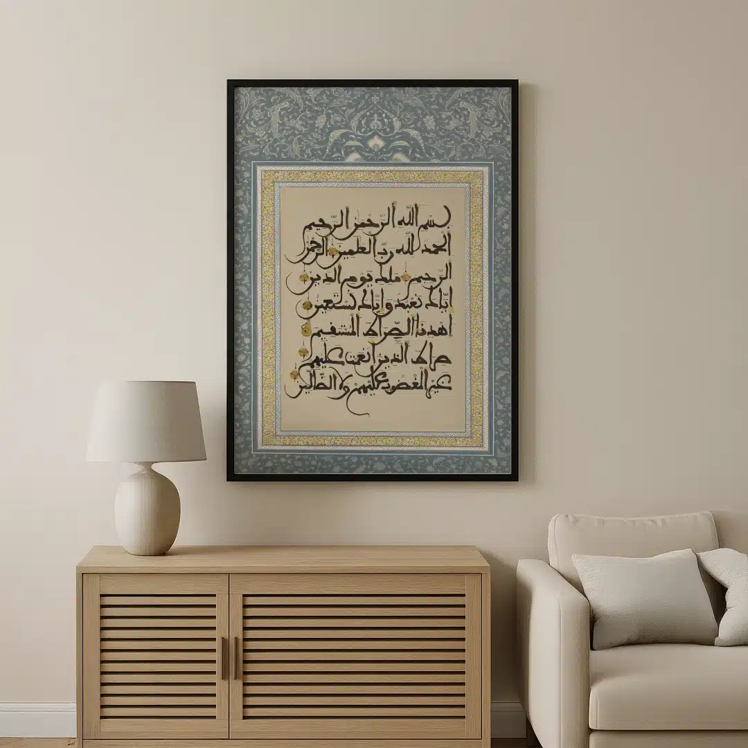 This artwork features Surah Al-Fatiha written in elegant traditional Arabic calligraphy, surrounded by an intricate floral border in muted blue, beige, and gold tones. The design radiates serenity, reverence, and timeless elegance — embodying both spiritual depth and artistic craftsmanship.