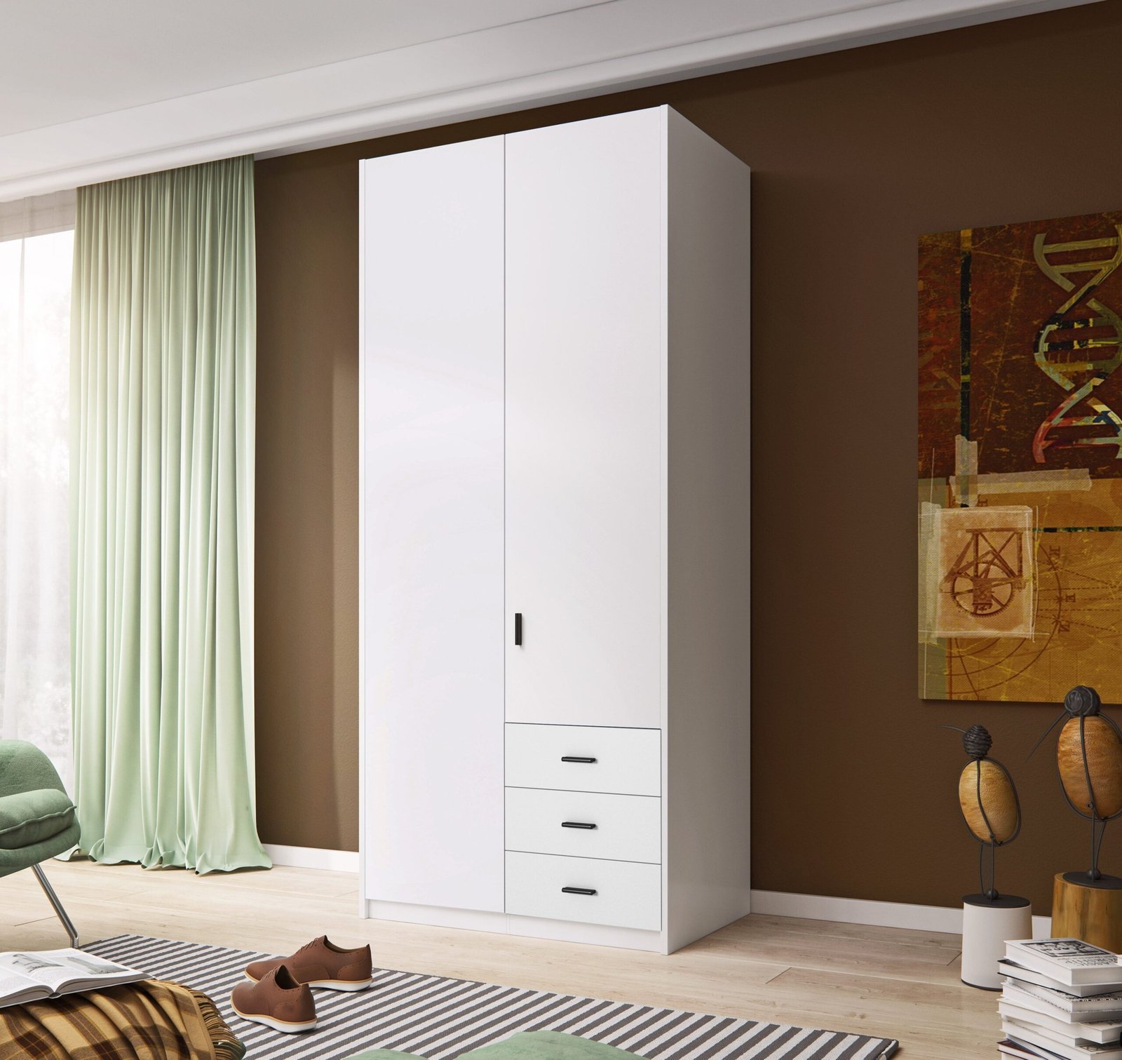 Some other styles are offering a variety of storage options in a functional, clean-lined silhouette. The 3 door wardrobe has an understated aesthetic that can seamlessly fit into modern or traditional bedroom styles. Boasting a smart painted finish, its hinged doors open to reveal a single metal rail for hanging clothes, while shelves and drawers provide additional storage for other accessories.